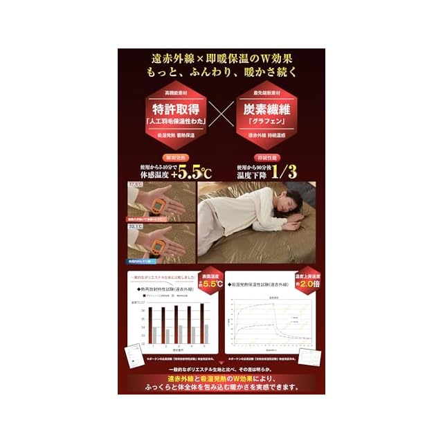【2025新開発!最先端素材エアロゲル×グラフェン】宇宙服にも使用される次世代断熱材「エアロゲル繊維」を中綿に使用した、羽毛布団を超える保温性を誇る掛け布団です。驚くほど軽く、体への負担が少ないため、快適な睡眠をサポートします。さらに、ノーベル物理学賞技術を応用した炭素繊維「グラフェン」を配合することで、0.3秒で体温を感知し、すばやく温まる速暖性と持続的な保温性を両立しました。遠赤外線効果、通気性、抗菌性能も備えているため、湿気やムレを軽減し、快適に冬をお過ごしいただけます。