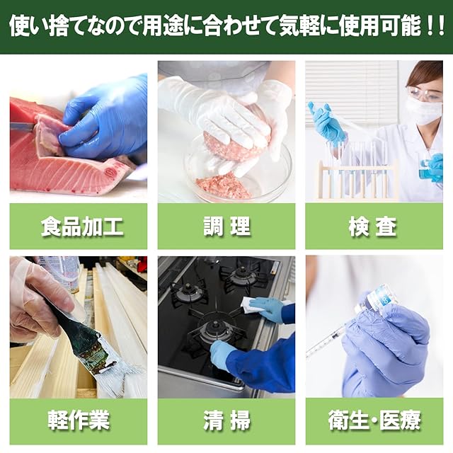 【用途】飲食店、部品組立など細かい作業、園芸作業、倉庫作業、掃除、清掃、介護、医療、病院などの衛生的な作業、キッチンや家事など、幅広い用途でご使用できます。
