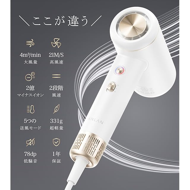 商品名:【LDK雑誌でA評価】【サタデープラスで紹介】 ANLAN ダブルケアドライヤーSE 速乾 大風量 低温 軽量 ドライヤー 4m³/分超大風量 <総合ランキング2位> 2億マイナスイオン 1200W 温冷リズム 風温4段階 低騒音 小型 母の日 プレゼント (ホワイト)