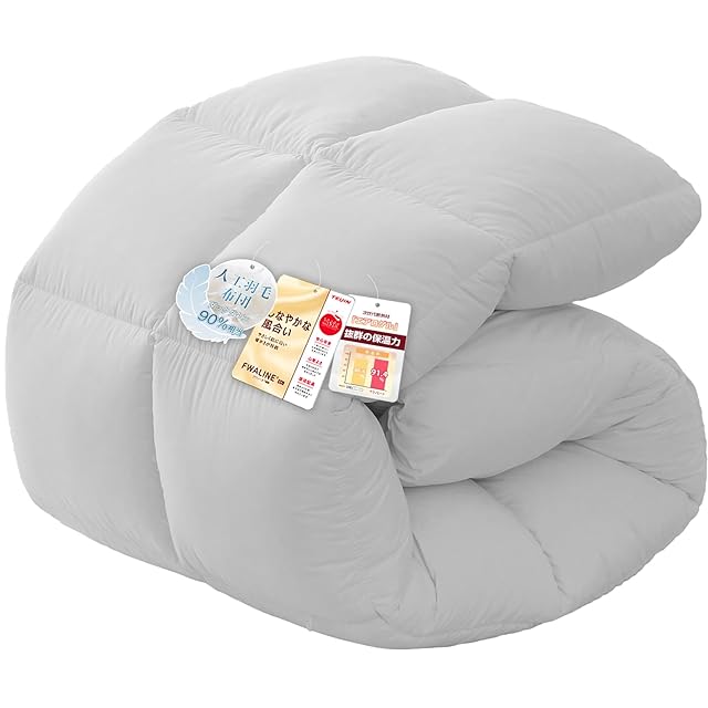 【通年用人工羽毛布団・商品仕様】「サイズ」シングル:150×210cm セミダブル:170×210cm ダブル:190×210cm ※キルティング製(許容範囲+5%,-3%)「側地」 ポリエステル100% 「中材中綿」帝人FWALINE50% エアロゲル50% 「ループ」8箇所付き 「企画国」日本【ご注意】お客様のご覧いただく環境により、色合いなどが異なる場合があります。実物とは色合いや明るさなどに相違が生じる可能性があるため、ご了承ください。万が一、商品に不具合がございましたら、お気軽に弊社までご連絡ください。迅速に対応させていただきますので、ご安心してお買い求めください。