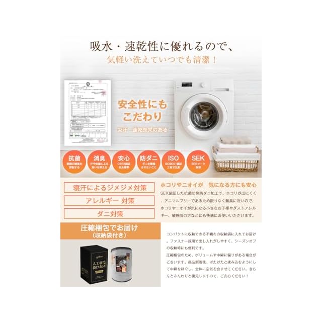 【ホコリが出にくい!アレルギーの方も安心】ホコリの量は羽毛布団の約1/14と少なく、徹底洗浄により衛生的です。敏感肌の方やお子様にも安心してお使いいただけます。【SEK認証·抗菌防臭防ダニ加工】ダニを寄せ付けにくく、優れた抗菌防臭効果で細菌の増殖や汗の臭いを抑制します。羽毛独特のニオイが苦手な方にもおすすめです。