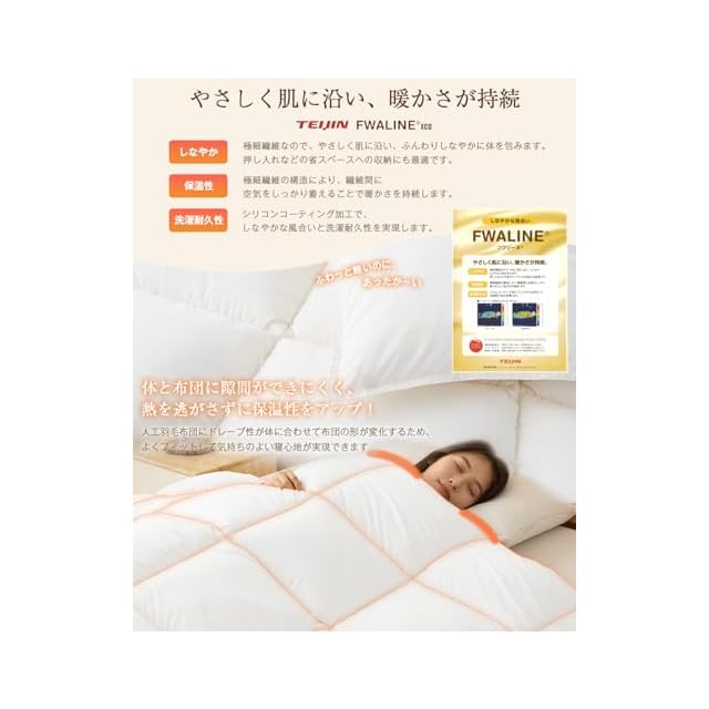 【立体キルト構造・保温性とドレープ性のバランスがよい】立体キルト加工により、お布団と身体の隙間ができにくく、暖かさをしっかり閉じ込めます。肩口から冷気が侵入するのを防ぎ、一晩中暖かさをキープ。さらに、高品質な「帝人FWALINE」を中綿に採用。肌に優しく沿い、ふんわりしなやかに身体を包み込みます。フィット性が高く、寝返りを打っても冷気が逃げにくいので、朝までぐっすりお休みいただけます。