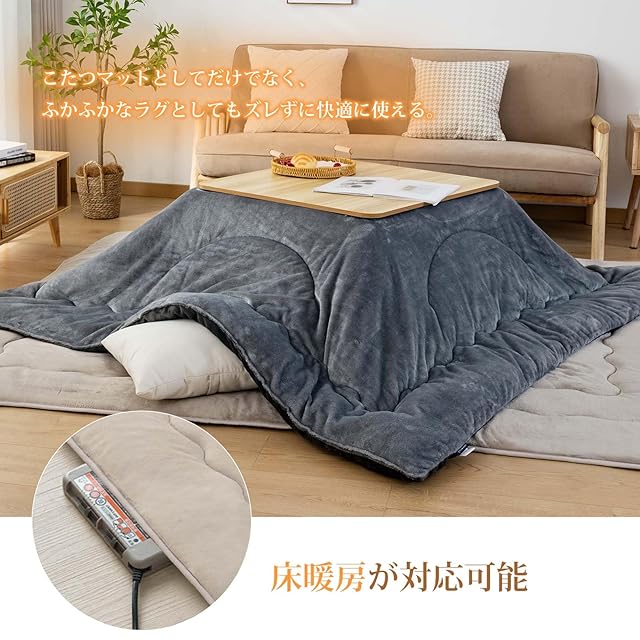 【床暖房対応】裏地滑り止め加工あり、床暖房も対応可能。こたつマットとしてだけでなく、ふかふかなラグとしてもズレずに快適に使える。