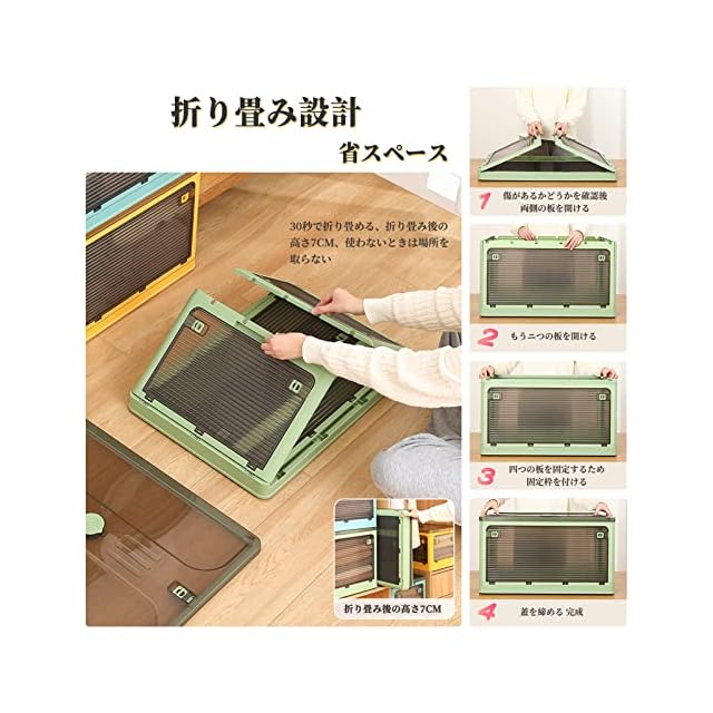 【折り畳み▪上に蓋/側面扉付き】収納箱界の大革新!使わない時に折りたたんで収納できます。スペースを取りません。側面四面も扉付き、収納にとても便利です。上にふた付き、物を入れやすい。蓋をロックできます。物を取るは側面扉から、ボックスを積み重ねる状態にも楽に物を取り出して、伝統的な収納ボックスに比べてもっと便利で、機能性が向上します。