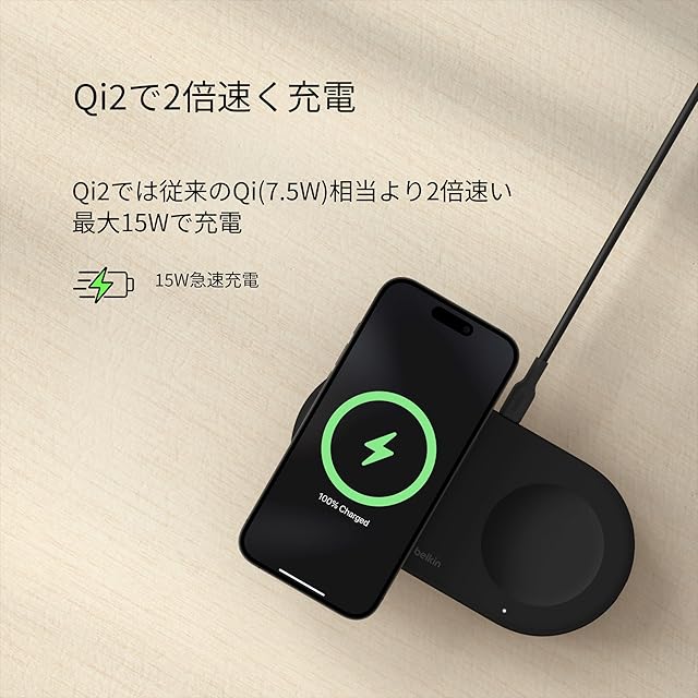 Belkin 2 in 1 ワイヤレス充電器 Qi2公式認証/MagSafe対応 iPhone17,16~12/スマートフォン(最大15W高速充電) AirPods/ワイヤレス充電対応イヤホン(5W充電) USB-Cケーブル付属(1.5m) AC電源アダプタの付属なし ブラック WIZ021qcBK