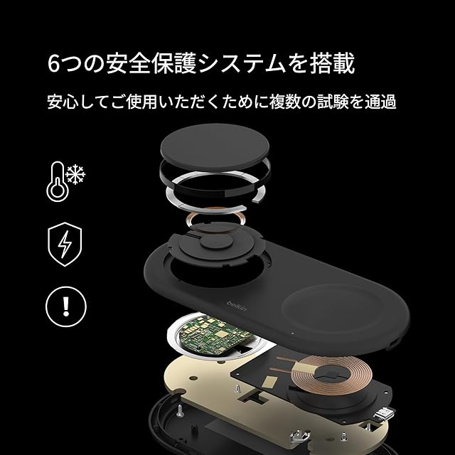 商品名:Belkin 2 in 1 ワイヤレス充電器 Qi2公式認証/MagSafe対応 iPhone17,16~12/スマートフォン(最大15W高速充電) AirPods/ワイヤレス充電対応イヤホン(5W充電) USB-Cケーブル付属(1.5m) AC電源アダプタの付属なし ブラック WIZ021qcBK