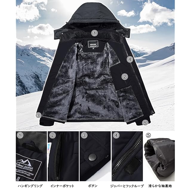 【多機能】1、撥水加工/防汚性/防風性:①防風、防水、防污のある機能性生地を採用します。②ファスナーは防水層デザインを付いて、防水性能を高めます。③ジャケットの継手の所に防水工芸を採用します。 2.防寒性/保温性:裏は裏起毛のデザインです。帽子と袖口の設計も保温性を強めます。 3.通気性/透湿性。
