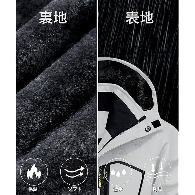 【多機能】1、撥水加工/防汚性/防風性:①防風、防水、防污のある機能性生地を採用します。②ファスナーは防水層デザインを付いて、防水性能を高めます。③ジャケットの継手の所に防水工芸を採用します。 2.防寒性/保温性:裏は裏起毛のデザインです。帽子と袖口の設計も保温性を強めます。 3.通気性/透湿性。