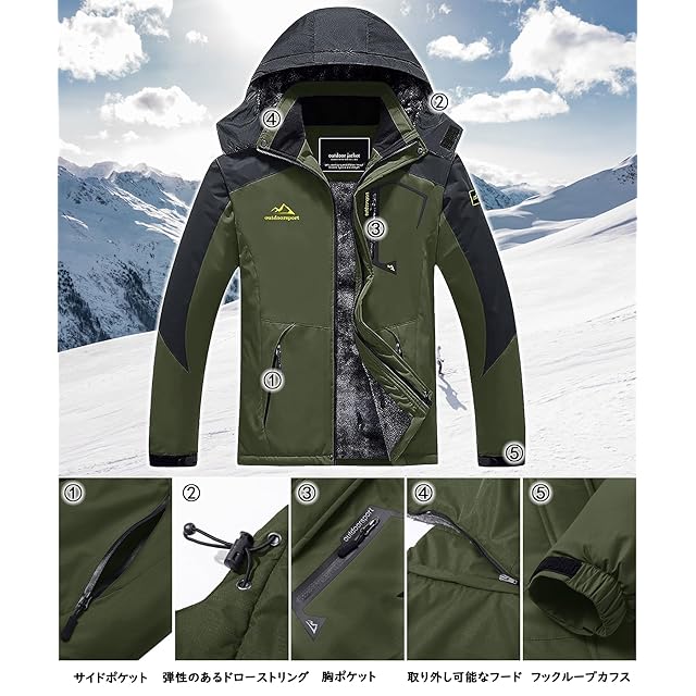 【多機能】1、撥水加工/防汚性/防風性:①防風、防水、防污のある機能性生地を採用します。②ファスナーは防水層デザインを付いて、防水性能を高めます。③ジャケットの継手の所に防水工芸を採用します。 2.防寒性/保温性:裏は裏起毛のデザインです。帽子と袖口の設計も保温性を強めます。 3.通気性/透湿性。