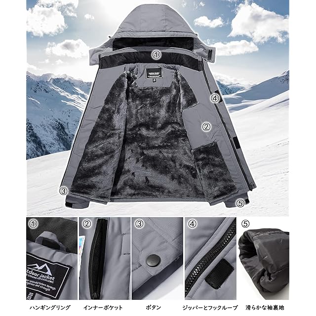 【多機能】1、撥水加工/防汚性/防風性:①防風、防水、防污のある機能性生地を採用します。②ファスナーは防水層デザインを付いて、防水性能を高めます。③ジャケットの継手の所に防水工芸を採用します。 2.防寒性/保温性:裏は裏起毛のデザインです。帽子と袖口の設計も保温性を強めます。 3.通気性/透湿性。