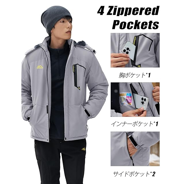 [KEFITEVD] ジャケット メンズ 冬 バイク防寒着 防風 マウンテンパーカー 裏ボア アウトドア 保温 防寒作業着 スキーウエア ライトグレー JP 3XL