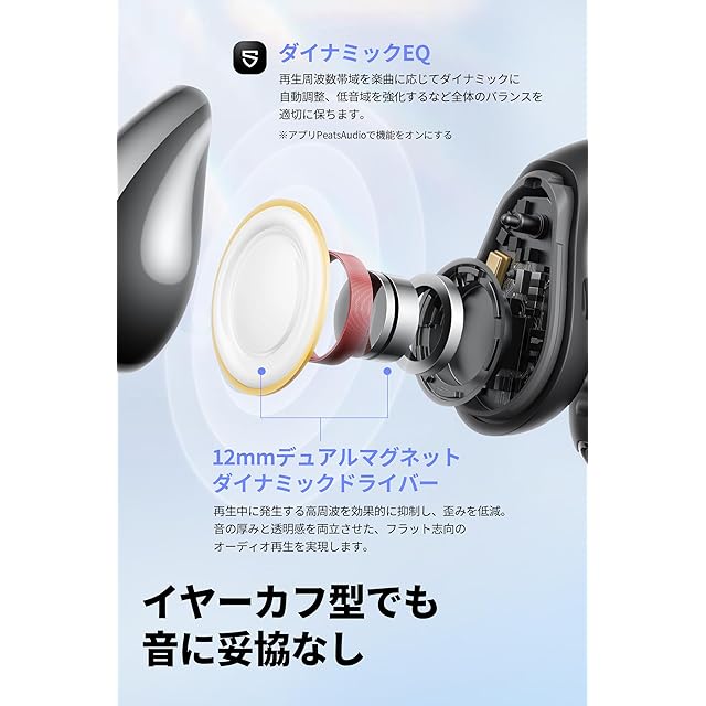 【SOUNDPEATS ブランド初のCCイヤーカフ】SOUNDPEATSの新しいデザインコンセプトを具現化した、ブランド初のCCイヤーカフ型イヤホンがついに登場!真珠から得たインスピレーションと最新のテクノロジーを組み合わせ、「装着感ゼロ!」を目指しつつ、優美なシルエットを生み出しました。C型ブリッジ部分に採用したニッケルチタン製形状記憶合金ワイヤーは、耐久性がありつつも高い弾力性を備えるため、さまざまな耳型にぴったりフィットします。しかも肌に優しい70%液体シリコンで覆われているから装着感は抜群、ほぼ“つけてる感”がありません。<br/> 【耳に挟むだけで聞こえる、「ながら聴き」体験の再定義!】イヤーカフ型のイヤホンだから、アクセサリー感覚で耳の軟骨を挟むだけで、耳の穴を塞がずに音楽を楽しめます。外部の音を完全に遮断しないため、車のクラクションやアナウンスなどの環境音も自然に聞き取れるので、安心してお使いいただけます。音楽を聴きつつ家事をしているときでも、家族と自然なコミュニケーションをとることができます。カナル型イヤホンの蒸れ・痛み・かゆみ、骨伝導型や耳掛け型で起こりがちな耳への負担、サングラスやメガネ、マスクとの干渉といった問題は発生しません。日常生活の様々なシーンで、音楽を聴きながら快適な長時間使用が可能です。<br/> 【左右の区別がないから収納はかんたん、急速充電対応】イヤホン本体は左右の区別がないから、充電ケースへの収納はかんたんそのもの。イヤホンを充電ケースに収納するだけで、イヤホンの左右チャンネルの自動切り替えが完了します。<br/> 【単体6時間連続再生、急速充電対応】イヤホン本体で最大6時間、充電ケースを含めると最大24時間の再生が可能です※。また急速充電に対応し、わずか10分の充電で2時間の再生が可能です。日常生活での使用はもちろん、長距離の移動やアウトドア活動にも適しており、急な充電切れにも安心。※再生時間は音楽再生時の時間であり、音量、再生内容、使用環境によって異なる場合があります。<br/> 【イヤーカフでも音に妥協なし、プロも太鼓判の高音質】CCイヤーカフは12mmデュアルマグネット・ダイナミックドライバーを搭載し、パワフルで繊細なサウンドと広がりのある音場を実現しました。シングルマグネットドライバーと比べ、より強力な磁場で振動板を効果的に駆動します。振動板の応答がより速くより正確になり、音の歪みも軽減され、特に高音と低音の表現において優れた性能を発揮します。日本のオーディオアワードVGP 2025では金賞・コスパ大賞を獲得、プロも太鼓判の音質を極上の装着感とともにお届けします。<br/> 【マルチポイント接続、CCイヤーカフをより便利に】Bluetooth 6.0に対応、安定した接続性と低遅延を実現しました。マルチポイント接続にも対応し、PCで音楽を聞いたり、ビデオ会議の最中にスマホにかかってきた着信へ応答することも簡単です。<br/> 【専用アプリ「PeatsAudio」対応、サウンドのカスタマイズも自由自在】 アプリ「PeatsAudio」ではイコライザーやタッチボタン設定のほか、ファームウェアアップデート でイヤホンを最新の状態に保つことができます。【好みに応じたサウンドモードを自由に選択】低音増強アルゴリズムを採用、「ダイナミックEQ」をオンにすると、より迫力のあるサウンドをお楽しみいただけます。さらに、新機能「ムービーモード」では、独自のアルゴリズムで音源を処理し、まるで映画館やライブ会場にいるかのような、臨場感あふれる立体音響を提供します。