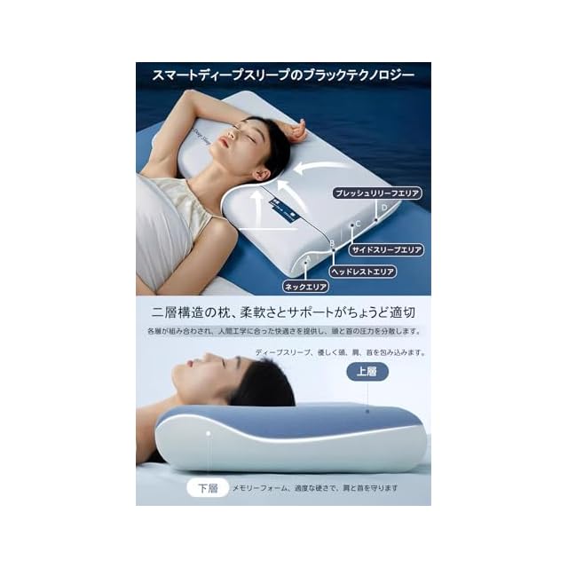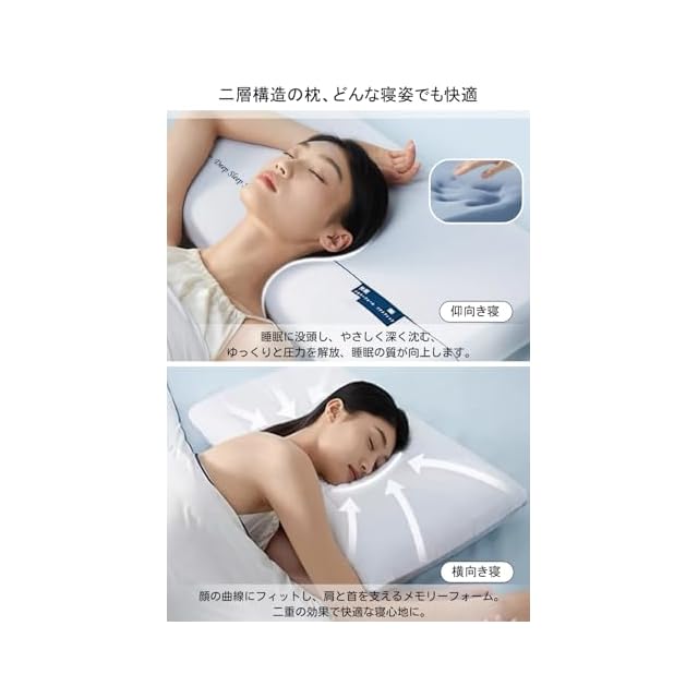 【理想的な寝心地を追求した2層構造】この枕は、2層構造により、柔軟さとサポート力を兼ね備え、個々の体型にぴったりフィットします。体圧を分散し、首や肩への負担を軽減。理想的な寝心地を実現します。