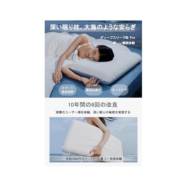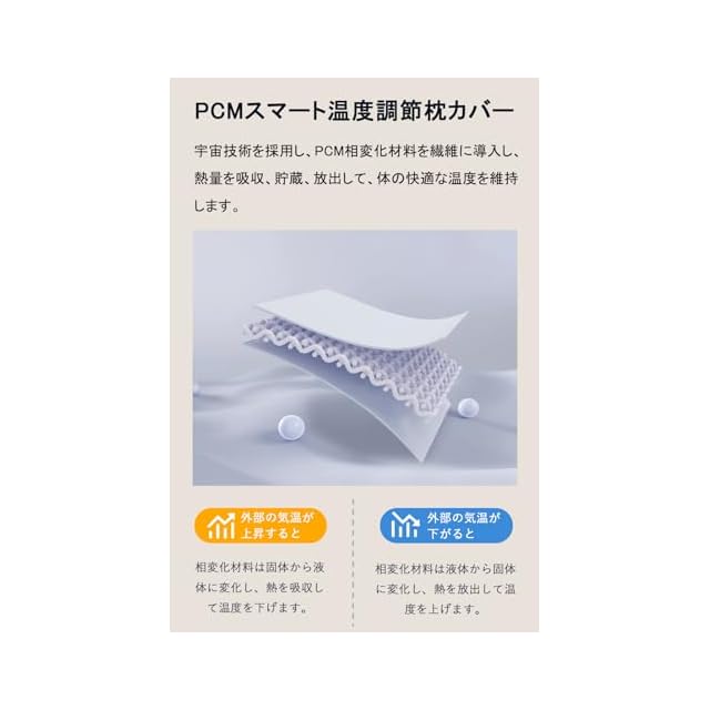 【一年中快適な温度調整】枕カバーには最新の宇宙技術を採用。PCM相変化材料が体温に反応して熱を吸収・放出し、季節に関わらず快適な睡眠環境を保ちます。