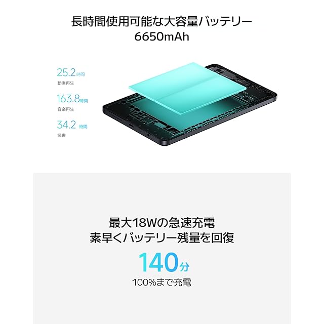 【6650mAhバッテリー、18Wの急速充電対応】25.2時間の動画再生、163.8時間の音楽再生、34.2時間の読書、6650mAhの大容量バッテリーにより、想像以上の駆動時間を実現。Redmi Pad SE 8.7シリーズは汎用性の高い18Wの急速充電に対応しており、急なバッテリー切れでも、しばらく充電すればすぐ回復します。