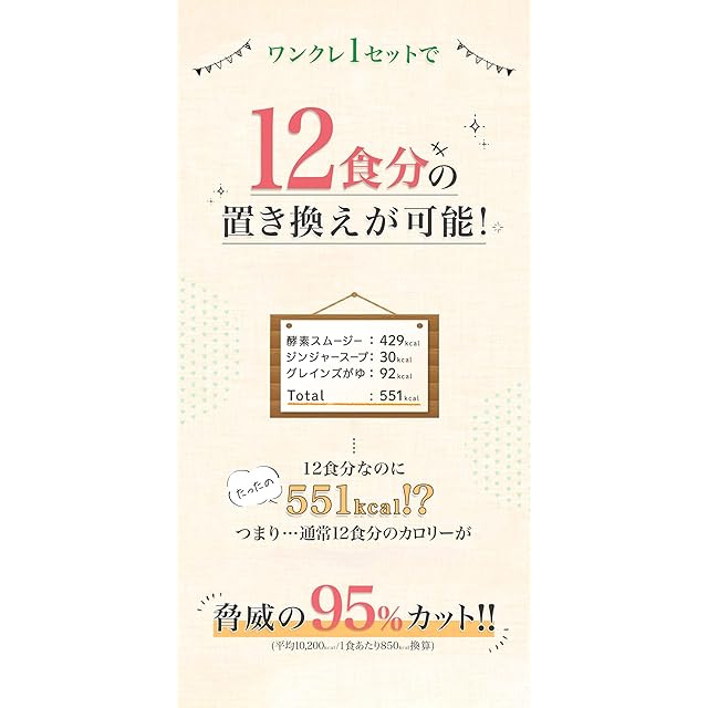 厳選された成分を1セットに凝縮:酵素スムージーは、ほうれん草やスイートコーン、グリーンピース等の23種類の野菜や植物原料にバナナとゆず皮を加えたスムージーの素です。ジンジャースープは、 国産のたまねぎをベースに、白菜やキャベツ、セロリの旨味を合わせ、国産の生姜を効かせ40種類以上の植物原料を使用した植物発酵エキスを配合したコンソメ風味のスープです。グレインズがゆは、九州産のもち米、大豆、赤米、黒米、発芽玄米をオリジナルブレンドし40種類以上の植物原料を使用した植物発酵エキスを配合したファスティング回復食用のお粥です。