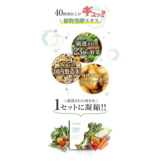 累計販売数100万セット突破(2025年10月20日時点)のGB 1DAY CLEANSE SET( グリーンブラザーズ ワンデイクレンズ セット )。新感覚のたった1週間のお手軽ファスティングダイエット。 ファスティングマイスターもおすすめ:ワンデイクレンズセットには、40種類以上の植物発酵エキスがぎっしりと詰まっているので、ダイエットに必要な酵素を効率的に摂取できます。ファスティングマイスターの管理栄養士もワンデイクレンズセットは、より多くの方に、気軽にファスティングに触れてもらうための商品としておすすめしています。