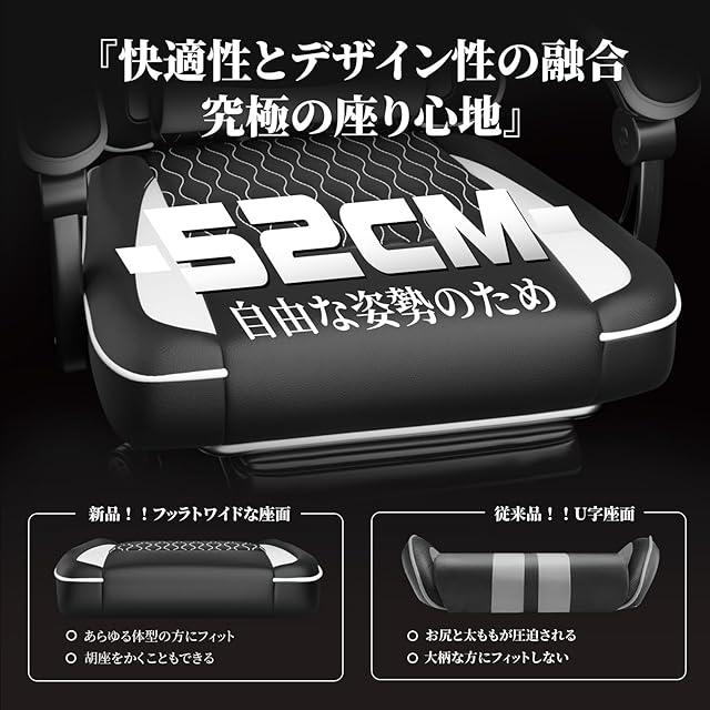 【広々とした平らな座面で快適な座り心地を実現】このゲーミングチェアは、座面の幅が52cmと少し大きめで、ゆとりある設計が特長です。伝統的なU字座面を改良し、両サイドを削って平らなデザインになっています。両足を広げても引っかからず、痛みを感じません。あらゆる体型の方にフィットします。体格の小さい方はそのまま座って胡座をかくこともでき、大柄な方はオットマンを利用して胡座をかくことも可能です。体重が均等に分散され、圧力が軽減されるため、疲労感が和らぎ、最も快適な座り心地をお楽しみいただけます。
