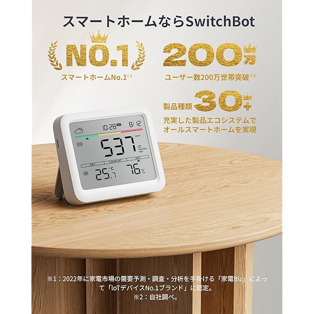 商品名:【冬の換気・乾燥対策】SwitchBot CO2センサー 二酸化炭素濃度計 温湿度計 アラーム - スイッチボット デジタル 大画面 高精度 CO2測定器 快適指数 天気予報 時計 卓上 カレンダー スマホ連動 アラート通知 グラフ記録 スマートホーム Alexa Google Home Siriに対応