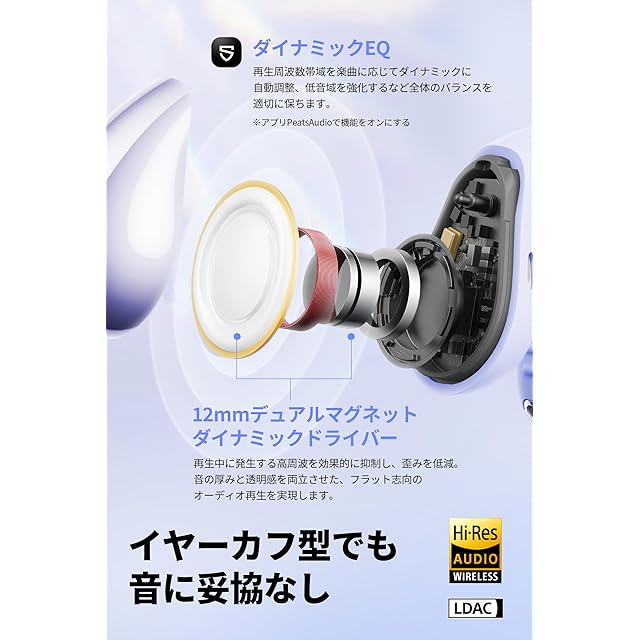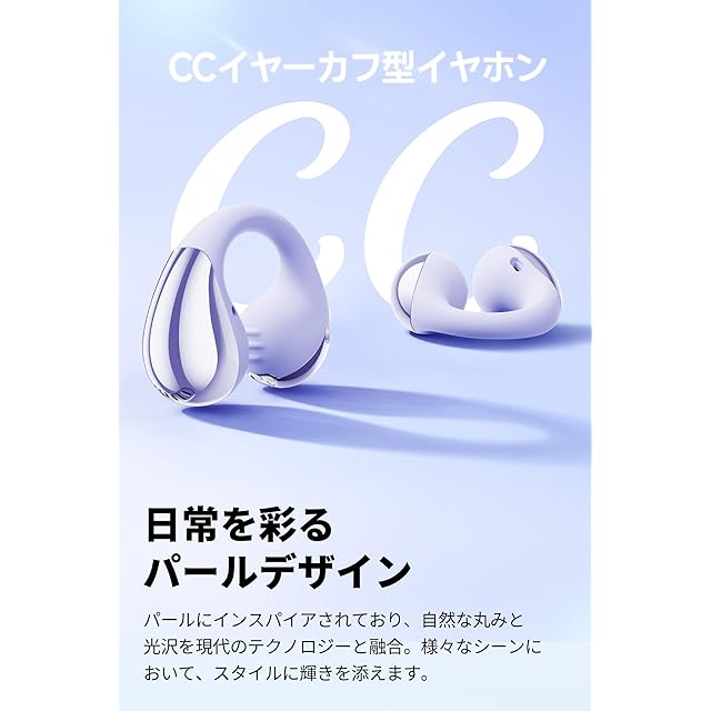 【ついにLDAC対応!クリップ型でもハイレゾ再生】最新バージョンのCCイヤーカフは、Bluetoothの標準オーディオコーデック(SBC)と比較して最大約3倍※の情報量を持つ「LDAC」に対応しました。LDACに対応した端末でご利用いただくと、ハイレゾ音源ならではの豊富な情報量を生かした高音質再生が可能になります。本製品は日本オーディオ協会が定めるハイレゾオーディオワイヤレス認証を取得しています。※Bluetooth A2DPのSBC(328kbps、44.1kHz時)との比較。※1「PeatsAudio」アプリでマルチポイント機能をオフにすると、LDACがご利用いただけます。※2 マルチポイント接続中はLDACはご利用いただけません。※3 LDAC使用時はムービーモードをご利用いただけません。<br/>【SOUNDPEATS ブランド初のCCイヤーカフ】SOUNDPEATSの新しいデザインコンセプトを具現化した、ブランド初のCCイヤーカフ型イヤホンがついに登場!真珠から得たインスピレーションと最新のテクノロジーを組み合わせ、「装着感ゼロ!」を目指しつつ、優美なシルエットを生み出しました。C型ブリッジ部分に採用したニッケルチタン製形状記憶合金ワイヤーは、耐久性がありつつも高い弾力性を備えるため、さまざまな耳型にぴったりフィットします。しかも肌に優しい70%液体シリコンで覆われているから装着感は抜群、ほぼ“つけてる感”がありません。<br/> 【耳に挟むだけで聞こえる、「ながら聴き」体験の再定義!】イヤーカフ型のイヤホンだから、アクセサリー感覚で耳の軟骨を挟むだけで、耳の穴を塞がずに音楽を楽しめます。外部の音を完全に遮断しないため、車のクラクションやアナウンスなどの環境音も自然に聞き取れるので、安心してお使いいただけます。音楽を聴きつつ家事をしているときでも、家族と自然なコミュニケーションをとることができます。カナル型イヤホンの蒸れ・痛み・かゆみ、骨伝導型や耳掛け型で起こりがちな耳への負担、サングラスやメガネ、マスクとの干渉といった問題は発生しません。日常生活の様々なシーンで、音楽を聴きながら快適な長時間使用が可能です。<br/> 【左右の区別がないから収納はかんたん、急速充電対応】イヤホン本体は左右の区別がないから、充電ケースへの収納はかんたんそのもの。イヤホンを充電ケースに収納するだけで、イヤホンの左右チャンネルの自動切り替えが完了します。<br/> 【単体6時間連続再生、急速充電対応】イヤホン本体で最大6時間、充電ケースを含めると最大24時間の再生が可能です※。また急速充電に対応し、わずか10分の充電で2時間の再生が可能です。日常生活での使用はもちろん、長距離の移動やアウトドア活動にも適しており、急な充電切れにも安心。※再生時間は音楽再生時の時間であり、音量、再生内容、使用環境によって異なる場合があります。<br/> 【イヤーカフでも音に妥協なし、プロも太鼓判の高音質】CCイヤーカフは12mmデュアルマグネット・ダイナミックドライバーを搭載し、パワフルで繊細なサウンドと広がりのある音場を実現しました。シングルマグネットドライバーと比べ、より強力な磁場で振動板を効果的に駆動します。振動板の応答がより速くより正確になり、音の歪みも軽減され、特に高音と低音の表現において優れた性能を発揮します。日本のオーディオアワードVGP 2025では金賞・コスパ大賞を獲得、プロも太鼓判の音質を極上の装着感とともにお届けします。<br/> 【マルチポイント接続、CCイヤーカフをより便利に】Bluetooth 5.4に対応、安定した接続性と低遅延を実現しました。マルチポイント接続にも対応し、PCで音楽を聞いたり、ビデオ会議の最中にスマホにかかってきた着信へ応答することも簡単です。<br/> 【専用アプリ「PeatsAudio」対応、サウンドのカスタマイズも自由自在】 アプリ「PeatsAudio」ではイコライザーやタッチボタン設定のほか、ファームウェアアップデートでイヤホンを最新の状態に保つことができます。【好みに応じたサウンドモードを自由に選択】低音増強アルゴリズムを採用、「ダイナミックEQ」をオンにすると、より迫力のあるサウンドをお楽しみいただけます。さらに、新機能「ムービーモード」では、独自のアルゴリズムで音源を処理し、まるで映画館やライブ会場にいるかのような、臨場感あふれる立体音響を提供します。