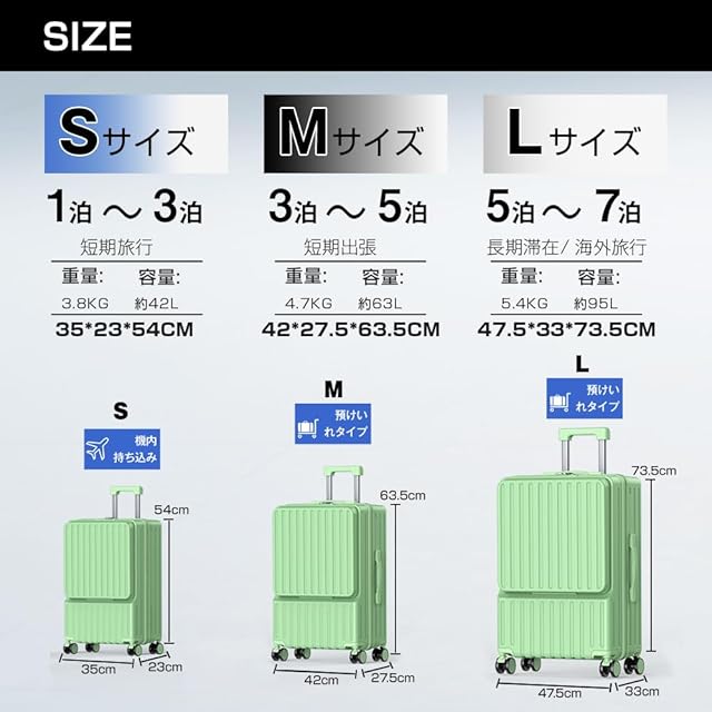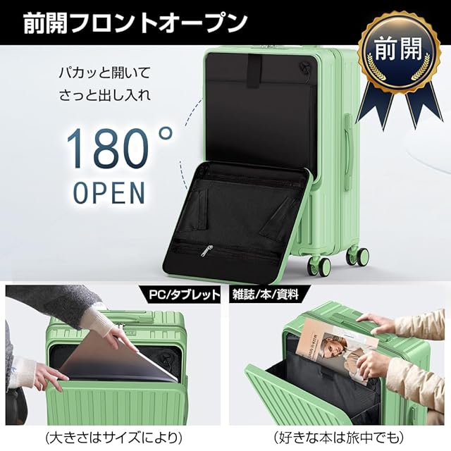 商品名:[BARGOHOY] スーツケース フロントオープン 多機能 キャリーケース 軽量 カップホルダー付き 隠しフック機能 キャリーバッグ USBポート付き 耐衝撃 静音 360度回転 TSAローク ファスナータイプ キャリーバッグ 人気 おしゃれ 旅行 ビジネス 出張 修学 泊まる 入院 (グリーン, Sサイズ機内持込OK /42L(1~3泊))