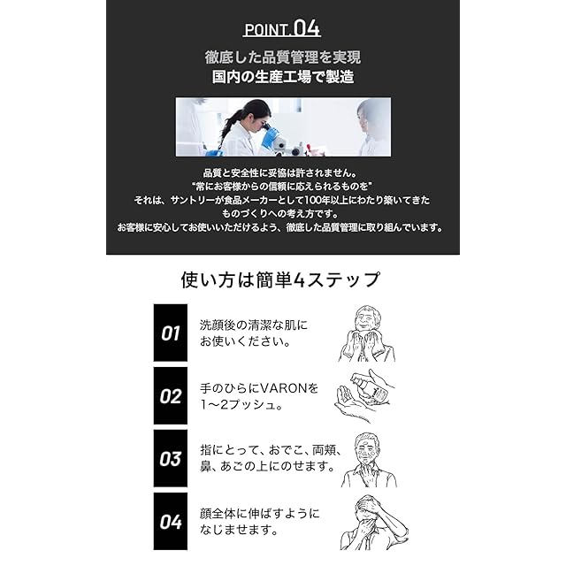 化粧水、美容液、クリームの役割順に3ステップで浸透※するオールインワンスキンケアです。<br> 1本だけの簡単お手入れを続けると、顔の印象は10日間で変えられます。ギトギト、カサカサが気になる大人の男性の肌つやをしっとり整え、すべすべすこやか肌へ。<br> ※角層まで<br> <br> こんな方におすすめです<br> 年齢を重ねても清潔感を保ちたい方<br>顔の表情を明るく保ちたい方<br> 肌の乾燥やベタつきが気になる方<br> 身だしなみとしてスキンケアを行いたい方<br> <br> おすすめする理由1<br> 人生100年時代の男性用オールインワンスキンケア<br> 男性の肌は、女性とくらべて皮脂量が多い一方で水分量が少ないため、べたつきやすく、かさつきやすい傾向があります。また、年齢を重ねていくと、長年のシェービングダメージや日焼けによる紫外線ダメージの蓄積で肌が乾燥しやすくなってしまいます。そんな悩み多き大人の肌をしっとりすこやかな肌へ導くために「VARON」は誕生しました。<br> 化粧水、美容液、クリームの役割順に3ステップでお肌に浸透※するオールインスキンケアです。<br> ※角層まで<br> <br> おすすめする理由2<br> サントリーの独自開発を含む4つの成分を配合<br> 肌荒れを防ぎ、しっとりつや肌へ導くウイスキー樽材エキス※1(サントリー独自開発)、男性特有のギトギト&カサカサをケアするイノシトール※2、肌にハリを与えるアセルヘキサペプチド-8※3、ウーロン茶のポリフェノールパワーを応用していきいきとフレッシュな印象へ導くウーロン茶エキス※4(サントリー独自開発)の4つのこだわりの成分を配合しました。<br> ※1 ヨーロッパナラ木エキス、BG:美容成分(保湿)<br> ※2 イノシトール、BG:美容成分(保湿)<br> ※3 アセチルヘキサペプチド-8、BG:美容成分(保湿)<br> ※4 チャ葉エキス、 BG:美容成分(保湿)<br> <br> おすすめする理由3<br> 紳士の大人肌へ導く独自の3ステップ浸透※技術を採用<br> サントリーは独自の技術「WOW*エマルジョン」で、安定させることが難しかったWOW*(水相・油相・水相)構造を実用化しました。<br> VARONは、他の一般的なオールインワンとは違う、WOW構造を活かした3ステップ浸透※技術で化粧水成分、美容液成分、クリーム成分が役割順に肌へ浸透していくため、1本のお手入れだけで、しっとりとしたすべすべ肌へ導きます。<br> ※角層まで<br> *WOWとは・・・<br> Water in Oil in Waterの略。水と油のように本来は混ざり合わないものを乳化剤を用いて、安定した形で均一に混ぜ合わせ、水相の中に油相、その油相の中にさらに水相が含まれている状態のこと。<br> <br> おすすめする理由4<br> 好みに合わせて選べる香り<br> 毎日つけるものだから、好きな香りで心地よくなりたい。好みに合わせて3つの香りをご用意しました。<br> 人それぞれ趣味趣向があるように、好きな香りも異なります。肌をケアするだけでなく、4つの香りの中から好みの香りを選ぶと気分も高まります。
