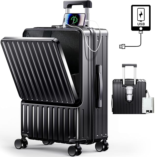 商品名:[BARGOHOY] スーツケース フロントオープン 多機能 キャリーケース 軽量 カップホルダー付き 隠しフック機能 キャリーバッグ USBポート付き 耐衝撃 静音 360度回転 TSAローク ファスナータイプ キャリーバッグ 人気 おしゃれ 旅行 ビジネス 出張 修学 泊まる 入院 (ブラック, Sサイズ機内持込OK /42L(1~3泊))