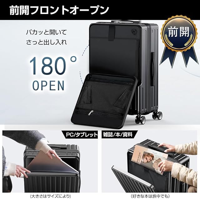 【新登場・フロントオープンデザイン】キャリーケース は前開きタイプのスーツケースはサッと荷物を取り出せて、持ち歩く際に便利です。Sサイズ/30*20,Mサイズ/38*28のPC、タブレット、書籍、携帯電話、チケットなど、荷物に合わせた細かなポケットを用意し、フロントポケット内の荷物の仕分けもラクラク。すぐに取り出せるフレックスルーフを備え、背面にはペットボトルや折りたたみ傘を収納可能なポケットを装備できる スーツケース です。