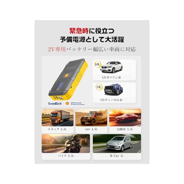 【最大電流800A】Shell バッテリー ジャンプスターターは800Aピーク電流で10000mAh大容量バッテリーが搭載しておりますので、12V車なら全般対応できます。6.0Lまでのガソリン車、2.0Lまでのディーゼル車もジャンプスタートできます。その上に、芝刈り機、オートバイク、船や普通乗用車、SUV、ピックアップトラックなど、緊急時に役立つ予備電源として大活躍になります。