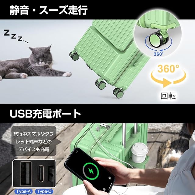 商品名:[BARGOHOY] スーツケース フロントオープン 多機能 キャリーケース 軽量 カップホルダー付き 隠しフック機能 キャリーバッグ USBポート付き 耐衝撃 静音 360度回転 TSAローク ファスナータイプ キャリーバッグ 人気 おしゃれ 旅行 ビジネス 出張 修学 泊まる 入院 (グリーン, Mサイズ/63L(4~7泊))