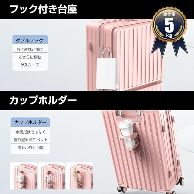 【折りたたみ式カップホルダー付き&USB充電ポート付き& 隠しフック機能】①こちらの キャリーケース USB充電ポート付き:便利なUSB充電ポート付き、場所を選ばずいつでもどこでも移動しながら効率よく充電ができます。②キャリーバッグ は折りたたみ式カップホルダー付き :便利な折りたたみ式ドリンクホルダー付き。バックカップホルダー、ミルクティーカップ、傘いつでも配置でき、旅行をより便利にすることができます。③隠しフック機能:隠しフックが搭載されており、バッグなどを掛けて、旅行中の手への負担を軽減できる キャリーケース 。