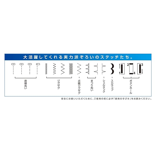 付属品:フットコントローラー、ジグザグ押え、ファスナー押え、ボタンホール押え、ボタン付け押え、ドライバー、リッパー/ブラシ、針パック、ボビン、シームガイド、糸こま押え(大小)、補助糸立棒、糸コマ座、使用のてびき、ソフトカバー