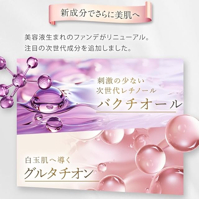 加水分解コラーゲン1000ppm、注目の美容成分、「ナイアシンアミド」、「アデノシン」に加え、次世代レチノールといわれる「バクチオール」、白玉肌へ導く「グルタチオン」など15種の美容成分配合。より高機能な美容液ファンデーションにへ進化しました。