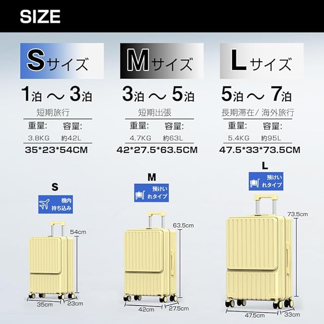 商品名:[BARGOHOY] スーツケース フロントオープン 多機能 キャリーケース 軽量 カップホルダー付き 隠しフック機能 キャリーバッグ USBポート付き 耐衝撃 静音 360度回転 TSAローク ファスナータイプ キャリーバッグ 人気 おしゃれ 旅行 ビジネス 出張 修学 泊まる 入院 (イエロー, Sサイズ機内持込OK /42L(1~3泊))