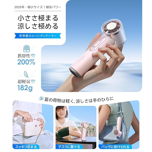 【2025最新作!業界最小サイズのハンディクーラー】2024 CESイノベーション賞受賞の超小型設計ハンディファン(45×50×150mm)。半導体冷却プレート搭載で、従来の手持ち扇風機より40%小型化。手のひらサイズ(182g)でありながら、本格的な冷房効果を実現。鞄ポケットにも収まるコンパクト設計で、通勤やアウトドアに最適。夏のファッションにも映えるおしゃれアイテムとして、熱中症対策を革新します。