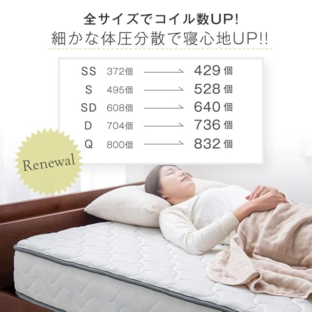 【スタッフのおすすめポイント!】<br><br> ・身体を点で支え、体圧分散に優れたポケットコイルマットレス<br> ・コイル数をUPしさらに細やかな体圧分散を実現<br> ・側面は通気性の良い3Dメッシュ<br> ・コイルあたりの少ないウレタン2層を加えたボリューム22cm<br> ・耐久性、通気性に優れた並行配列コイル<br> ・形崩れを防ぐエッジサポート<br> ・エコテックス認証の高級ニット生地<br> ・シックハウス症候群の原因物質7種をしっかり検査<br> ・圧縮梱包だから、搬入もラクラク!<br> ・片面仕様にすることで、お手入れも簡単に<br>