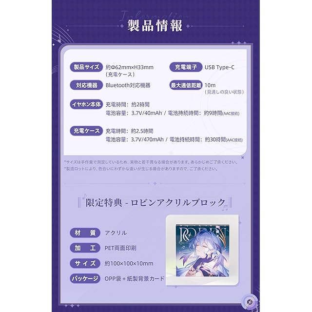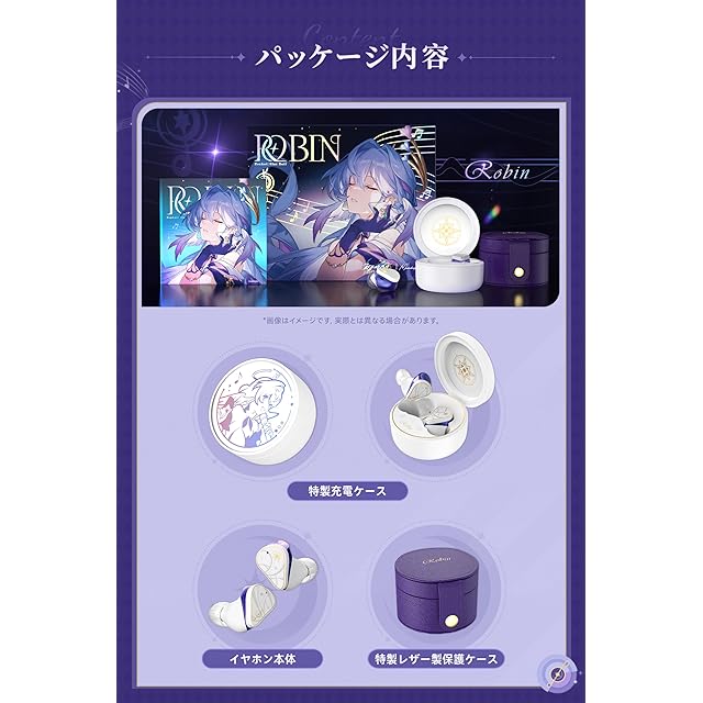 崩壊:スターレイル × 水月雨【ロビンコラボモデルイヤホンセット】:高忠実度·ANC対応ワイヤレスイヤホン、ハイブリッドドライバー(DD+Planar)搭載。3Dプリント技術で製造された部品により、カスタムイヤホンに匹敵するフィット感を実現。パッケージ内容:ロビンイヤホンセット(日本向け特別仕様)、キャラクターデザインのイヤホン本体、ロビン完全録り下ろしオリジナルボイス(日本国内限定)、限定特典のキャラクターアクリルブロック、キャラクターデザインのレザー製保護ケース。