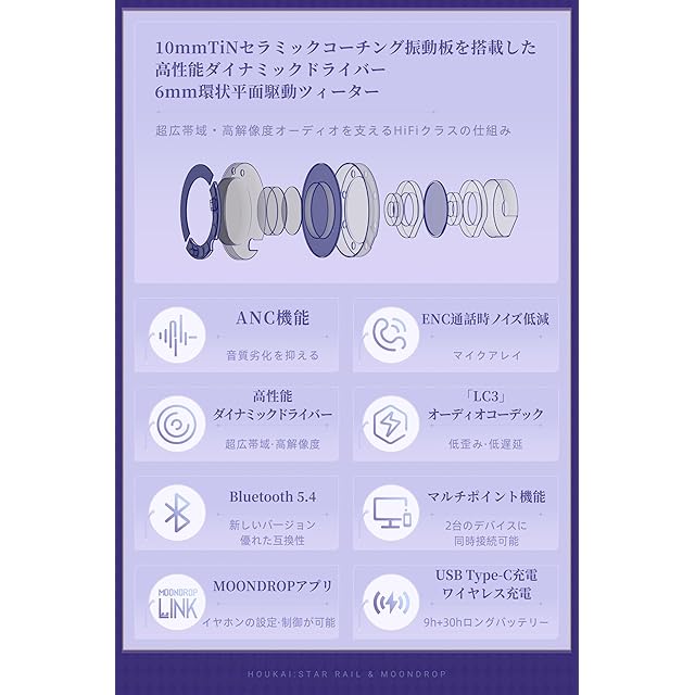 水月雨 MOONDROP x 崩壊:スターレイル Robin's Earphones ワイヤレス イヤホン インナーイヤー型 ロビンスペシャル音声ガイダンス【日本限定】Bluetooth 5.4 / ANC対応 / ハイブリッドドライバー(DD+Planar) / LDAC対応 / 五檔低音調節切換 / ワイヤレス充電 / 最大39時間音楽再生