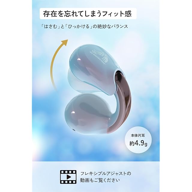 【アクセサリー感覚の軽く快適なつけ心地】 本機は、アクセサリー感覚で身に着けられるイヤーカフ型を採用。イヤホン本体には、当社独自の「フレキシブルアジャスト」機構を搭載し、耳に軽く挟んで装着する際に着脱しやすくするとともに、軽く快適な着け心地も実現。眼鏡やサングラスを着用したままでも使用でき、エクササイズやジョギングなど動きのあるシーンでも、長時間装着する場合でも、快適に使用できます。