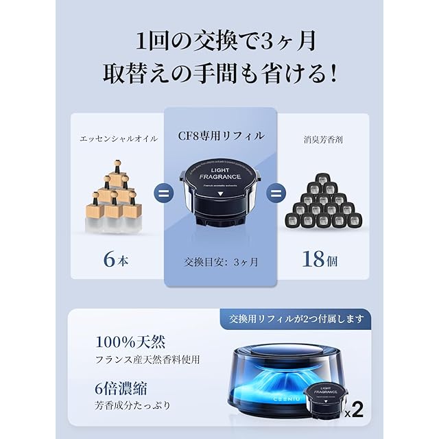 ✅【6ヶ月分の精油リフィル付き】 二つの精油リフィルをお付けします。内蔵のカウンターにより、1つのリフィルで1200回のスプレーが可能です。週に10時間の運転をする場合、二つのリフィルで約6ヶ月間お使いいただけます。