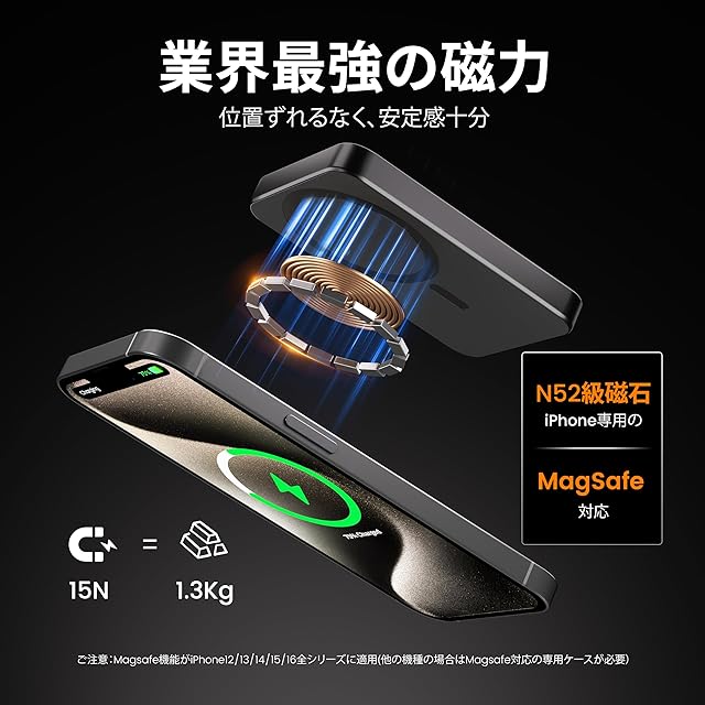 【業界最強磁力、軽く貼るだけで即充電】Yamisan のマグネット式ワイヤレスモバイルバッテリーには18個のN52級強力磁石が内蔵され、軽く貼るだけでしっかりと吸着できます。市販品より15倍も強い磁力を持ち、位置ずれによる充電不能という普通のワイヤレス充電の弱点を効果的に克服し、バッグやポケットに入れても安定して充電できます。iPhoneと一緒にMagsafe充電を手に持って行うことができるため、ケーブルが不要で有線充電の煩わしさを解消します。※ご注意:本製品のマグセーフ充電機能は、Magsafe対応のスマートフォンなどのデバイスおよび磁石式ワイヤレス充電に対応する場合のみ使用可能です。