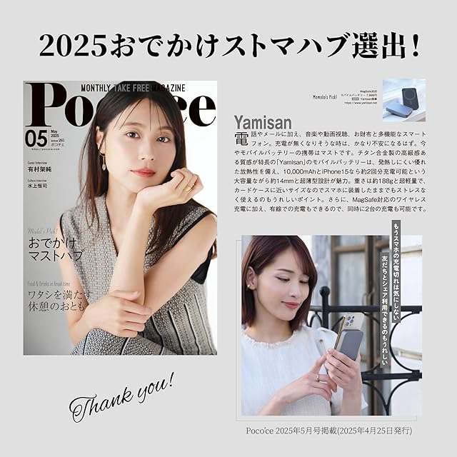 【業界最強磁力、軽く貼るだけで即充電】Yamisan のマグネット式ワイヤレスモバイルバッテリーには18個のN52級強力磁石が内蔵され、軽く貼るだけでしっかりと吸着できます。市販品より15倍も強い磁力を持ち、位置ずれによる充電不能という普通のワイヤレス充電の弱点を効果的に克服し、バッグやポケットに入れても安定して充電できます。iPhoneと一緒にMagsafe充電を手に持って行うことができるため、ケーブルが不要で有線充電の煩わしさを解消します。※ご注意:本製品のマグセーフ充電機能は、Magsafe対応のスマートフォンなどのデバイスおよび磁石式ワイヤレス充電に対応する場合のみ使用可能です。