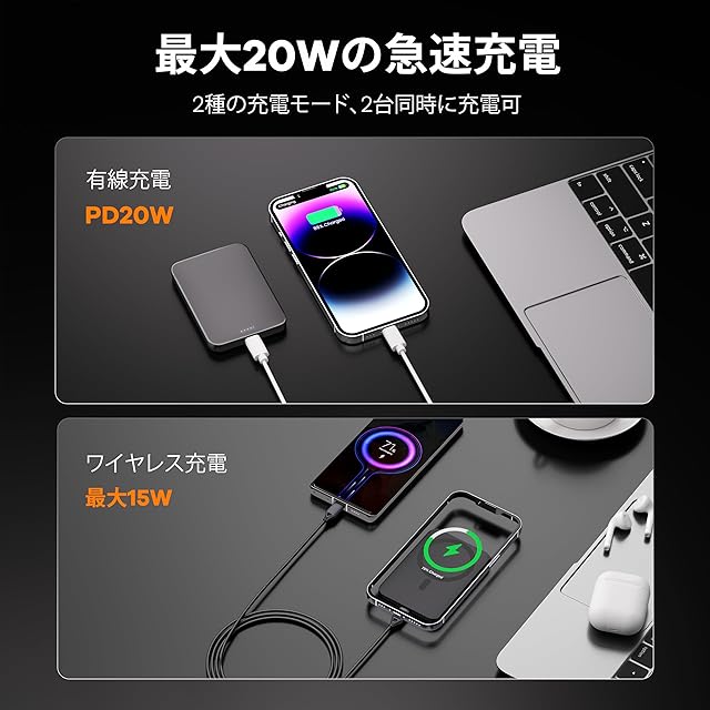 【最大20Wの急速充電、広範な互換性】このワイヤレス充電器はMagsafeに対応し、Qualcomm社会のPD/QC 3.0などの充電規格に適合します。ワイヤレス充電(15W)とType-Cポート有線充電(20W)の二つの高速出力モードを備え、驚くほどのスピードでデバイスに電力を補充することができます。iPhone air/17/16/15/14/13/12シリーズ(Magsafe充電対応)およびほぼ全てのAndroidデバイス(ワイヤレス充電/有線充電両方に適用)に対応します。ワイヤレスと有線の方式で同時に二台の機器を充電でき、友達とシェアしたり、家族に提供したりするのに大変便利です。※ご注意:同時充電時、デバイスが発熱する可能性があります。ご了承ください。