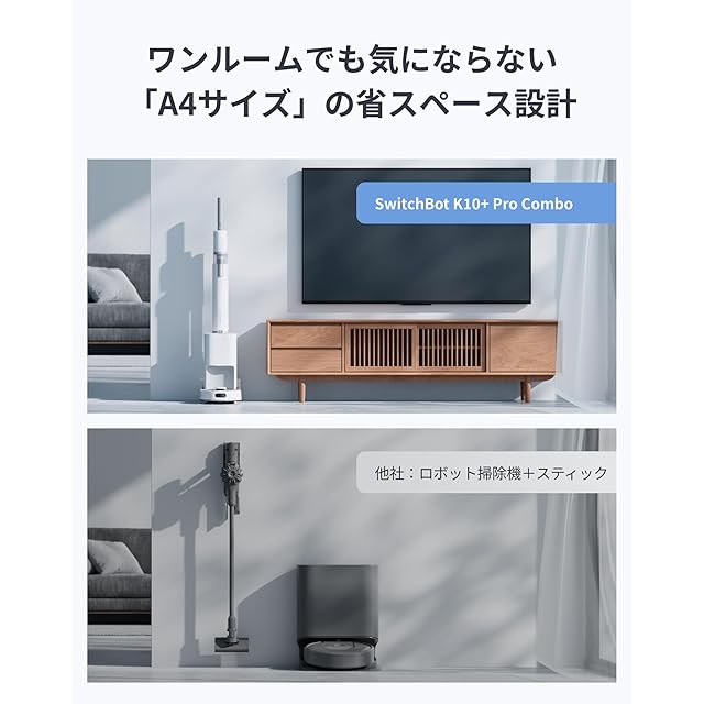 【省スペース設計】A4サイズのわずかなスペースに、ロボット掃除機とスティッククリーナーが収まっています。ワンルームのアパートや物が多いご家庭でも気にせずお使いいただけます。