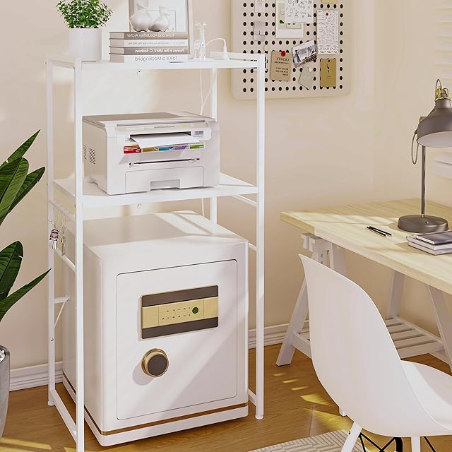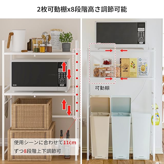 【多機能収納ラック】棚板は収納する物に合わせて高さを調整可能です。約11㎝ぐらいの8段階可動棚で、下部のスペースにはゴミ箱、冷蔵庫、洗濯機などを収納できます。棚板の上部にはレンジ台やプリント台などを置くことができます。