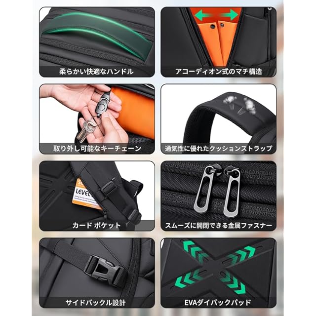 【細部までこだわり抜く】①大容量で拡張機能付き、必要に応じて容量を調整可能。②42Lの容量ながら軽量で、約1.2kg。③人間工学に基づいたデザインで、肩への負担を軽減。④収納ポケットが多く、整理しやすい設計。⑤ショルダーストラップにカードポケット付きで、カードの出し入れが簡単。⑥ショルダーストラップは調節可能。⑦ファスナー付きの隠し盗難防止ポケットを搭載。⑧背面にはスーツケースに固定できるストラップ付き。⑨フロントポケットにはキーリングがあり、鍵の出し入れがスムーズ