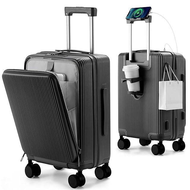 [Mularda] 前開きキャリーケース スーツケース機内持ち込み 耐衝撃 超軽量 USBポート付き Sサイズ 大容量 1-3泊 旅行 ビジネス 出張 ブラック