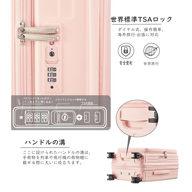 【三段調節キャリバー・世界基準の安全性】超軽量のアルミニウム製キャリバー、高さ三段階調節、ご自分の身長に合わせてスムーズに調整が可能です。耐振性に優れるデザインで荷物を引きかける時、しっかりしています。また、滑りにくいソフトハンドルで長い時間の手提げでも手は疲れません。海外旅行には欠かせないTSAダイヤル方式のロックが搭載されており、外出がより安全になります。※鍵は航空会社検査専用のため本製品には付属しておりません。