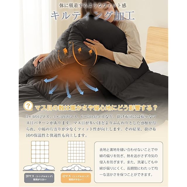 【帝人FWALINE+ピーチスキン加工・体にフィットする暖かさ】高品質の「帝人FWALINE」を中綿に採用し、肌に優しく沿い、ふんわりしなやかに身体を包み込みます。極細繊維の構造が繊維間に空気をしっかりと蓄えることで、暖かさを長時間持続させます。【両面ピーチスキン加工】ふわふわで柔らかな肌触りカバーなしで快適お使いいただけます。