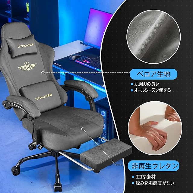 商品名:GTPLAYER ゲーミングチェア なめらかなベロア デスクチェア オフィスチェア あぐら 椅子 ゲーム用チェア リクライニング ハイバック テレワーク椅子 PCチェア フットレスト 連動アームレスト ポケットコイル 座面の幅 50cm 四季適用 在宅ワーク 通気性 GT829-LIGHTGRAY